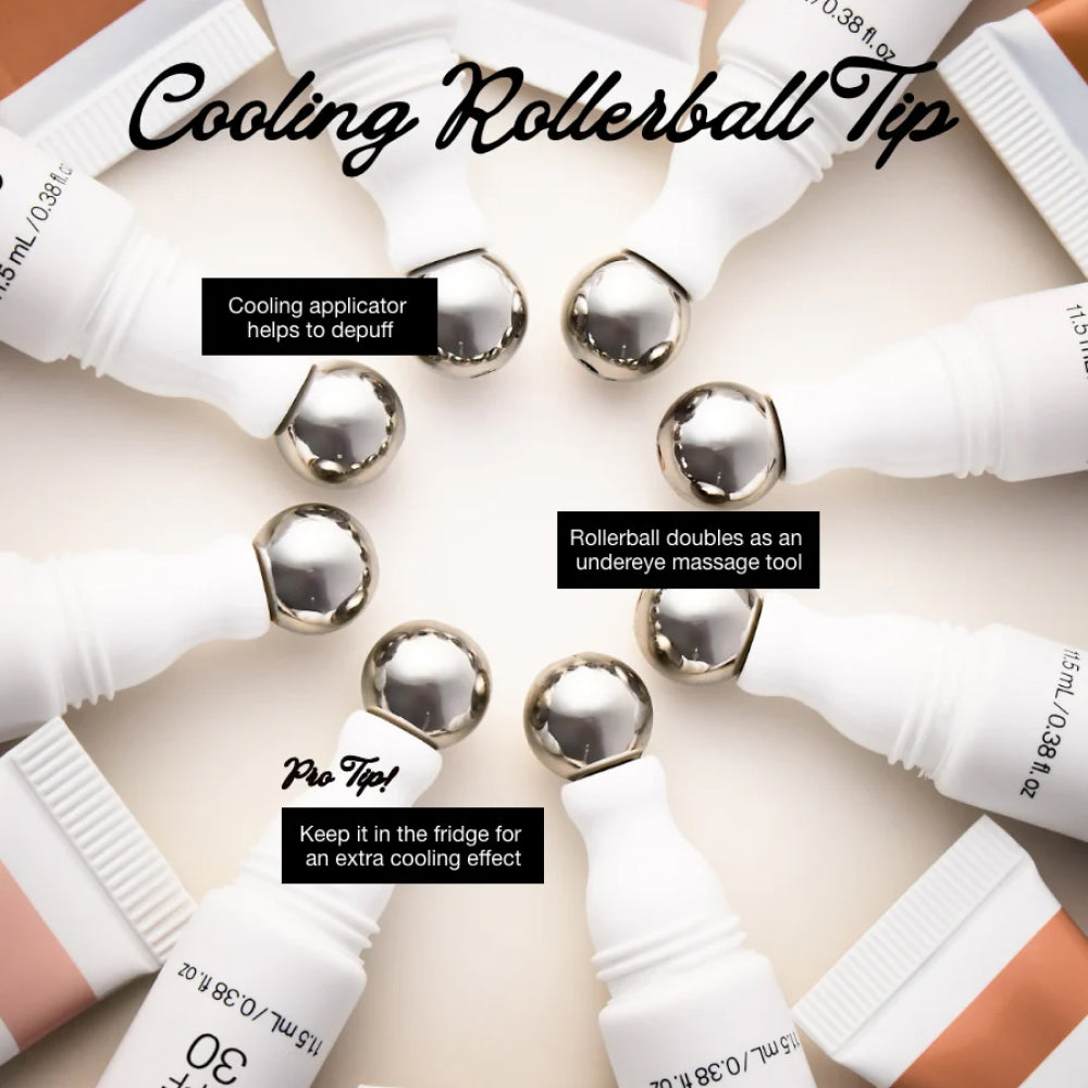• Breng aan met de verkoelende metalen rollerball onder de ogen, tot aan de wenkbrauw en ook op de oogleden.